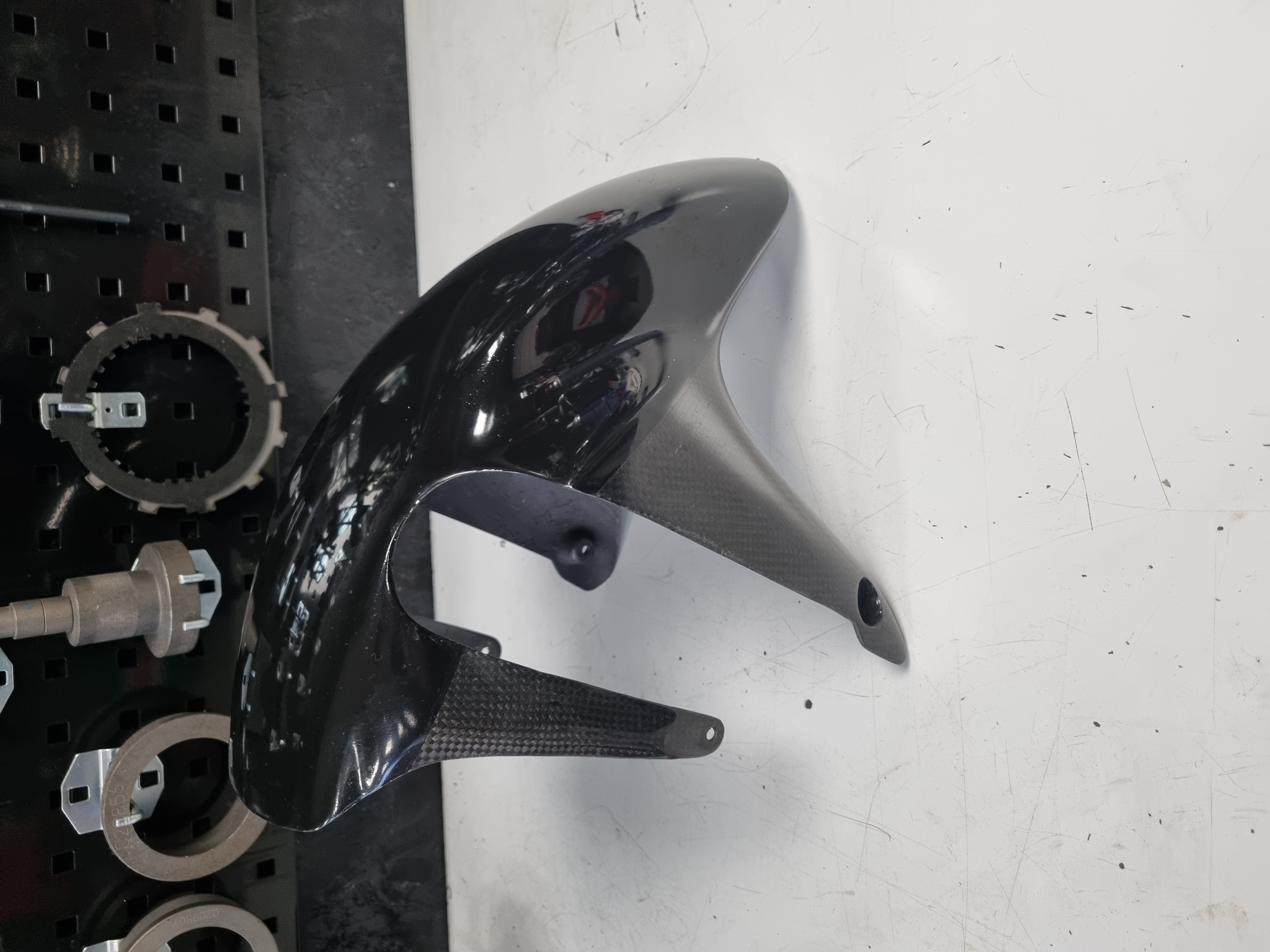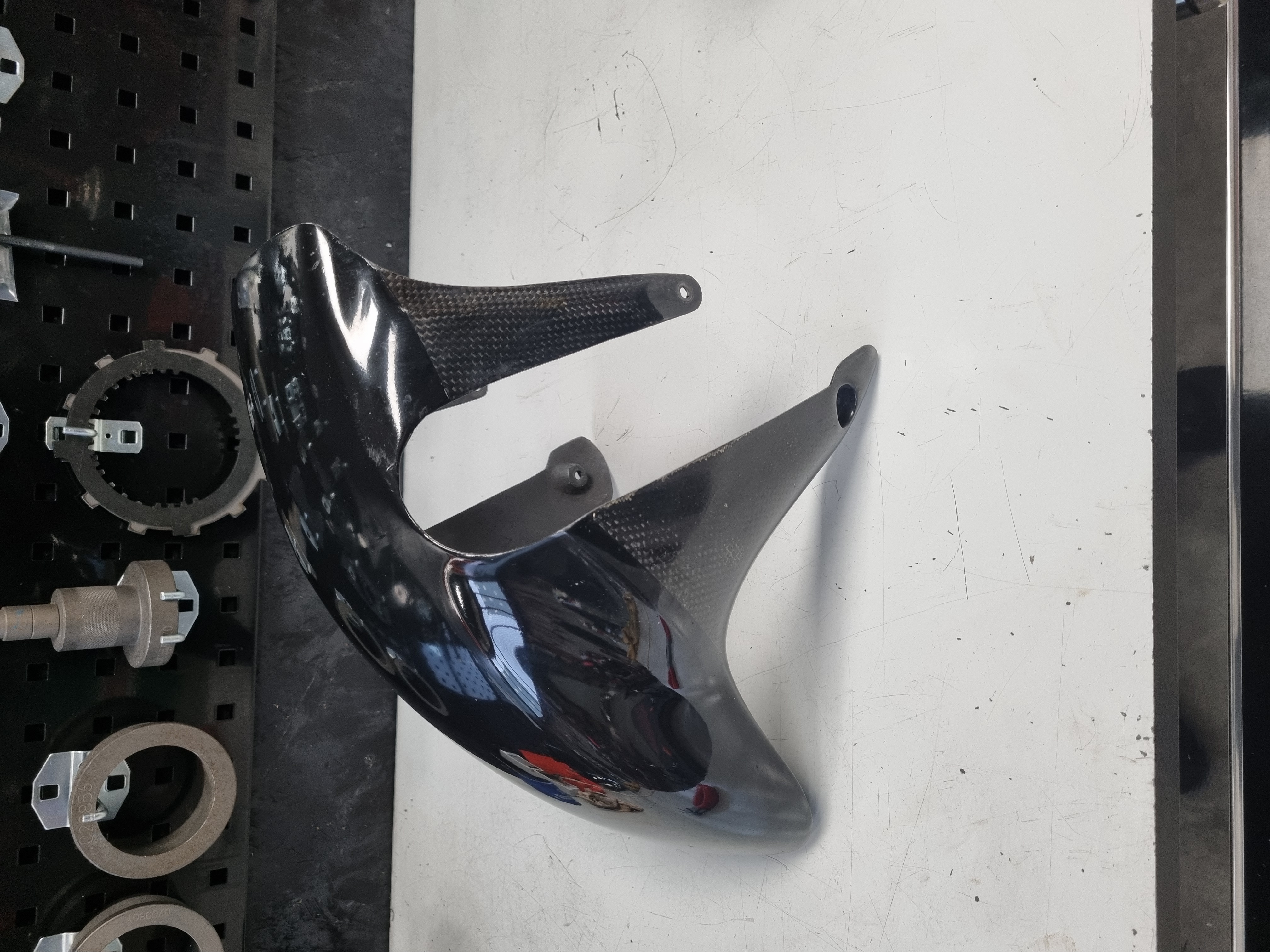 Carbon spatbord, bovenkant is zwart gespoten.