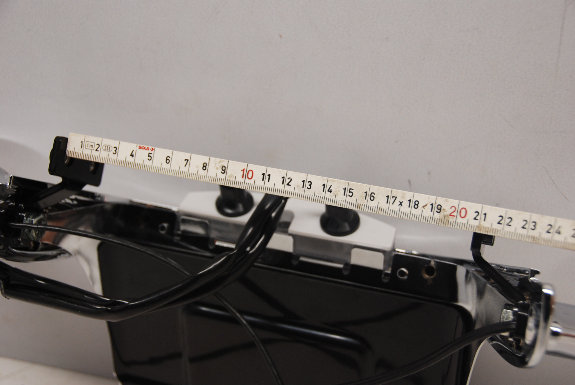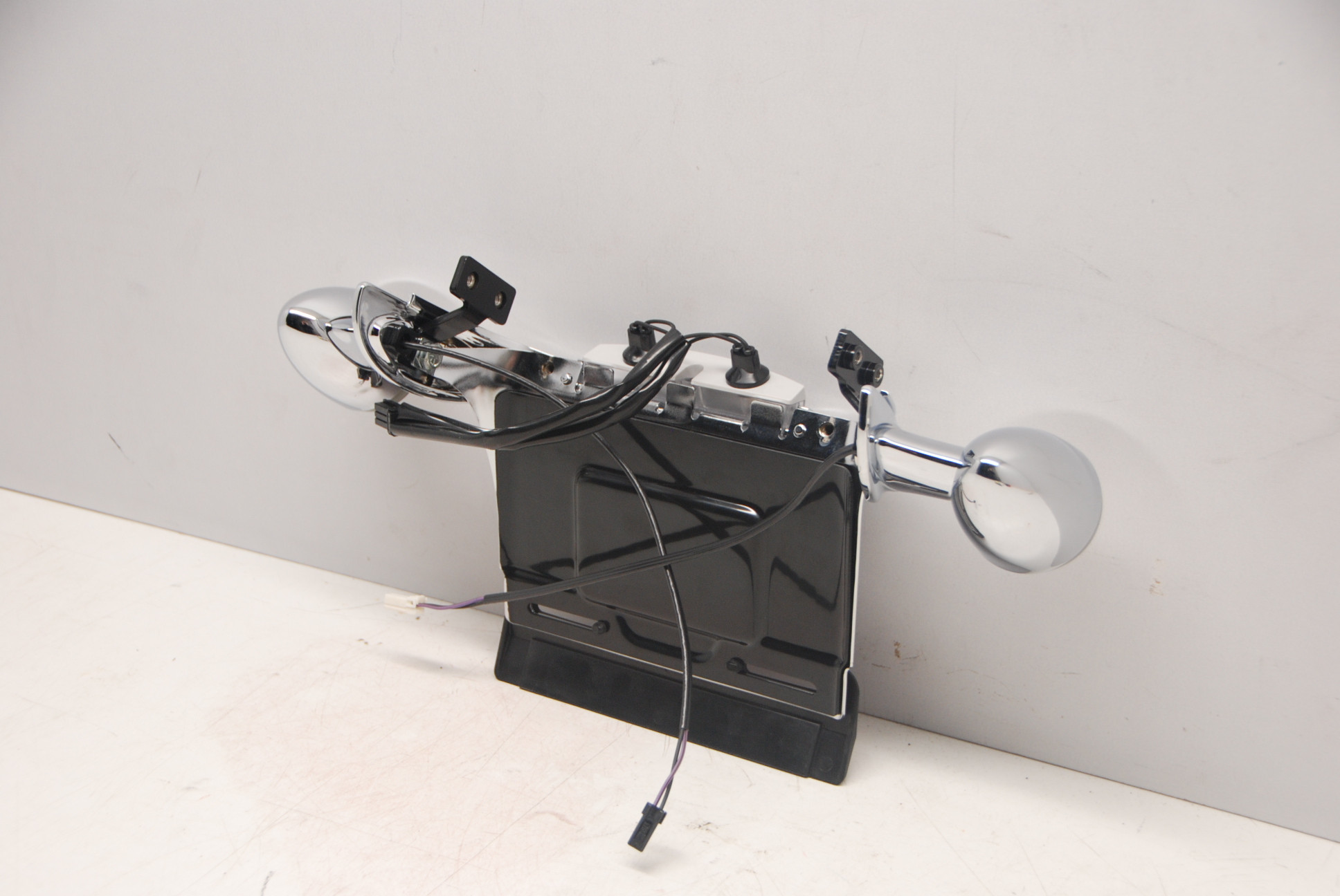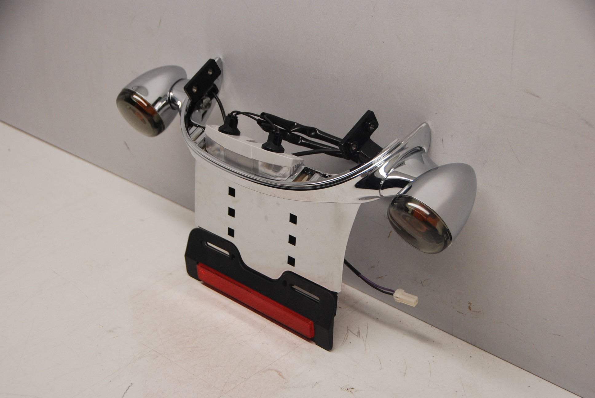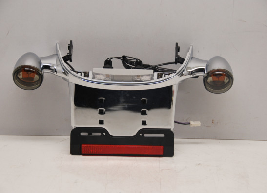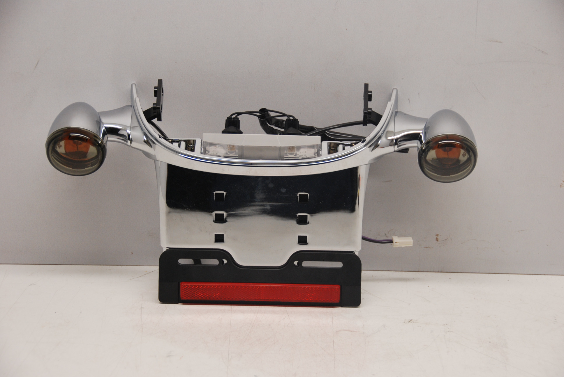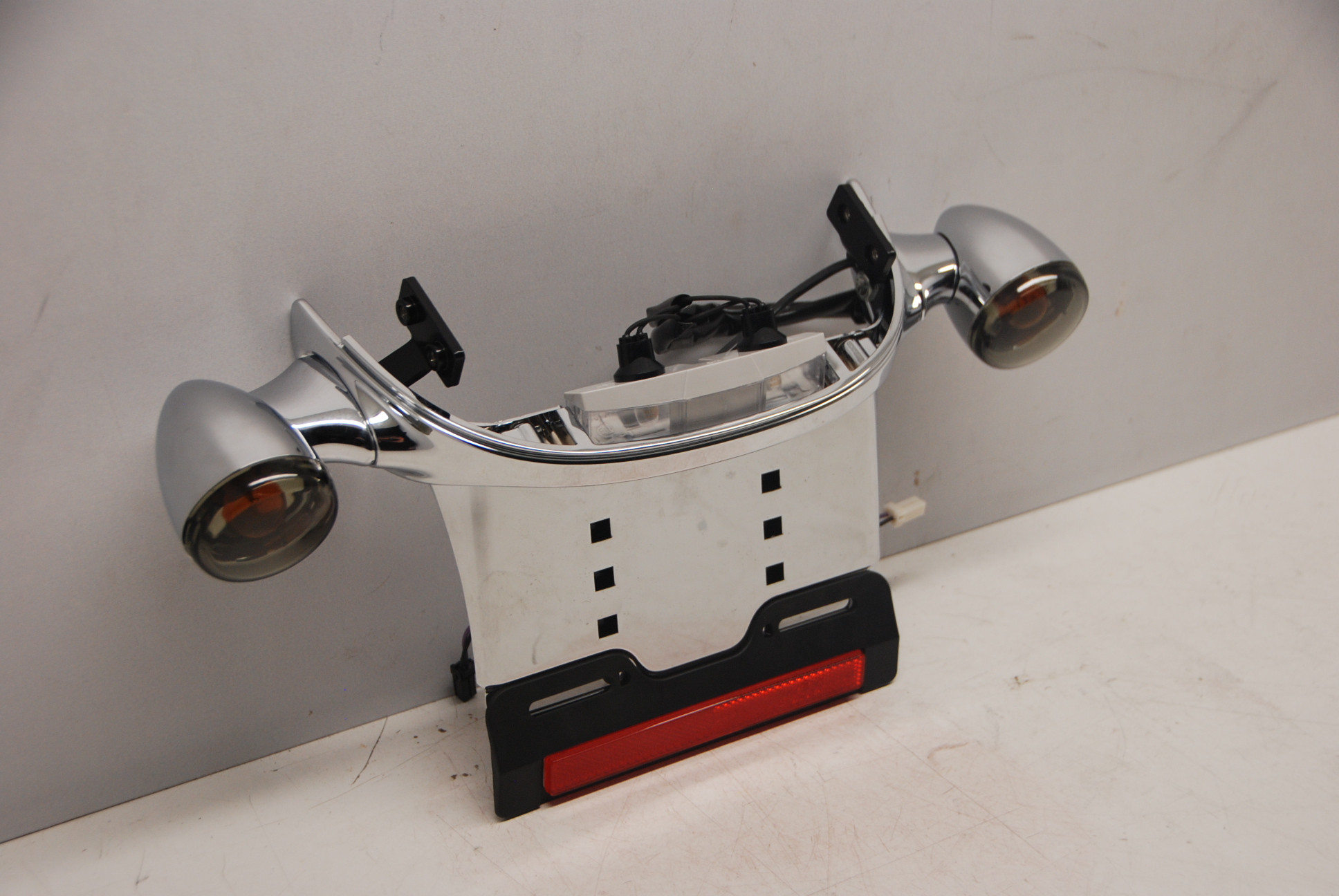 OEM Harley Davidson CHROME dog's ass rear license plate and turn signal assembly. This unit was from the wide tire kit 43818-06 and it's BRAND NEW, See the measurements in the pics as they show how wide the fender needs to be, this is not a direct bolt onto the 02-05 v rods