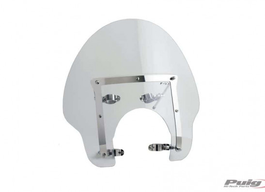 Het betreft een mooi windscherm met chromen strips en zorgt voor een betere windbescherming. Het windscherm wordt geleverd inclusief bevestigingsset. Totale hoogte 560mm, totale breedte 560mm, hoogte vanaf koplamp uitsnede 35cm. Kleur: transparant. Merk Puig. Voor de Kawasaki VN1600 Classic
